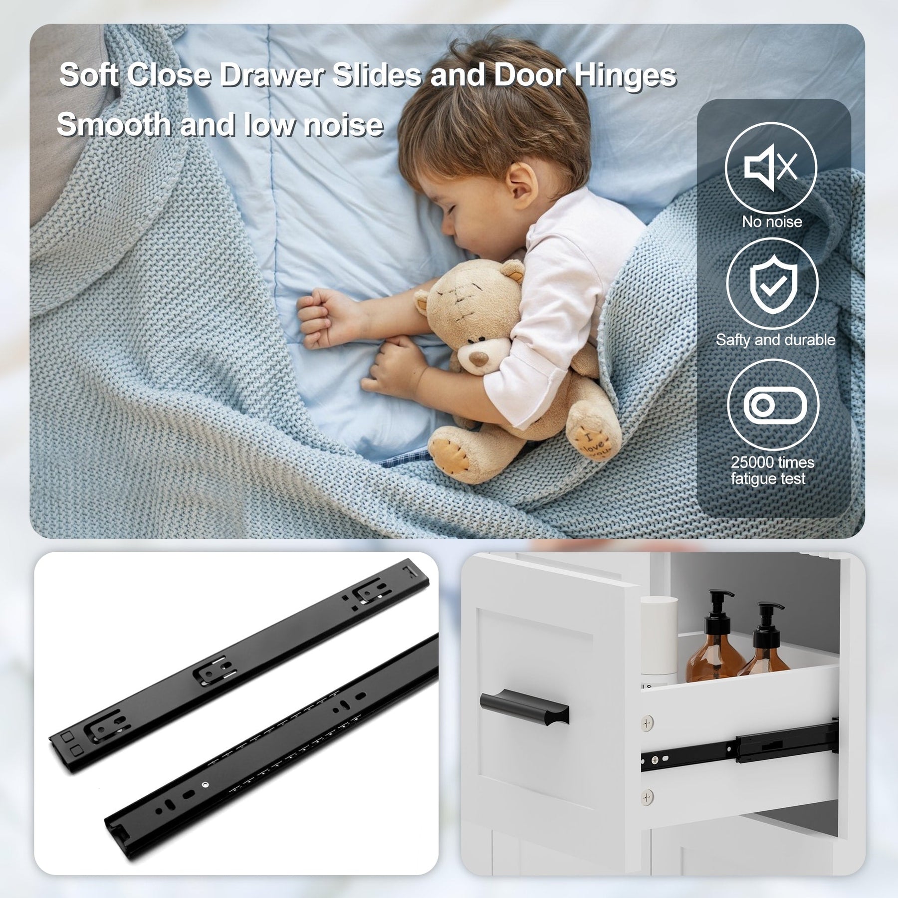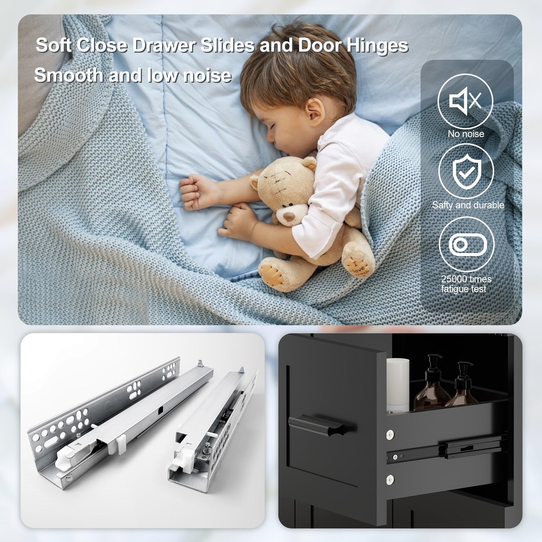 - Premium Soft-Close Drawers: Stainless steel undermount slides (25,000-cycle tested) ensure silent, smooth operation. 2 spacious drawers + adjustable shelf organize toiletries effortlessly.