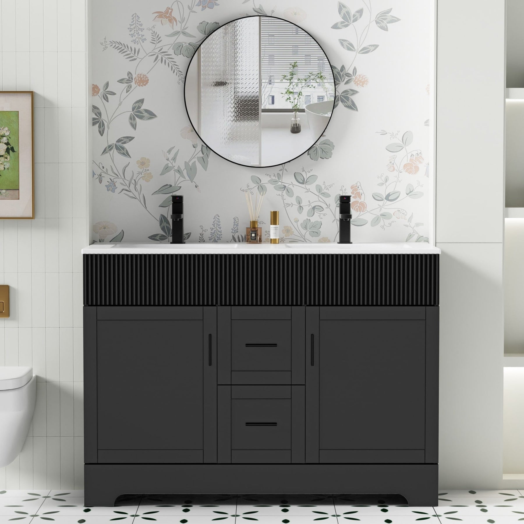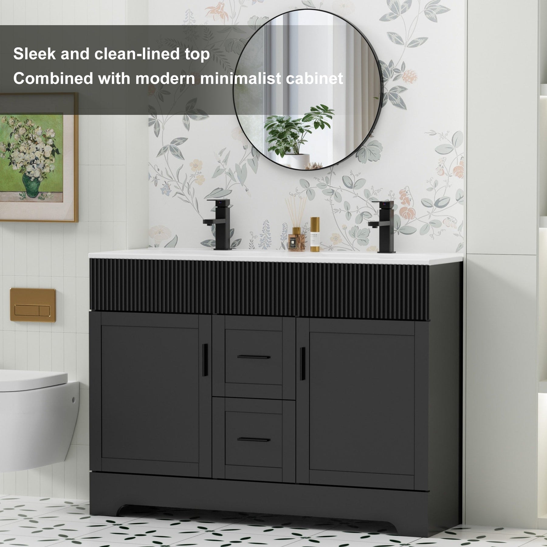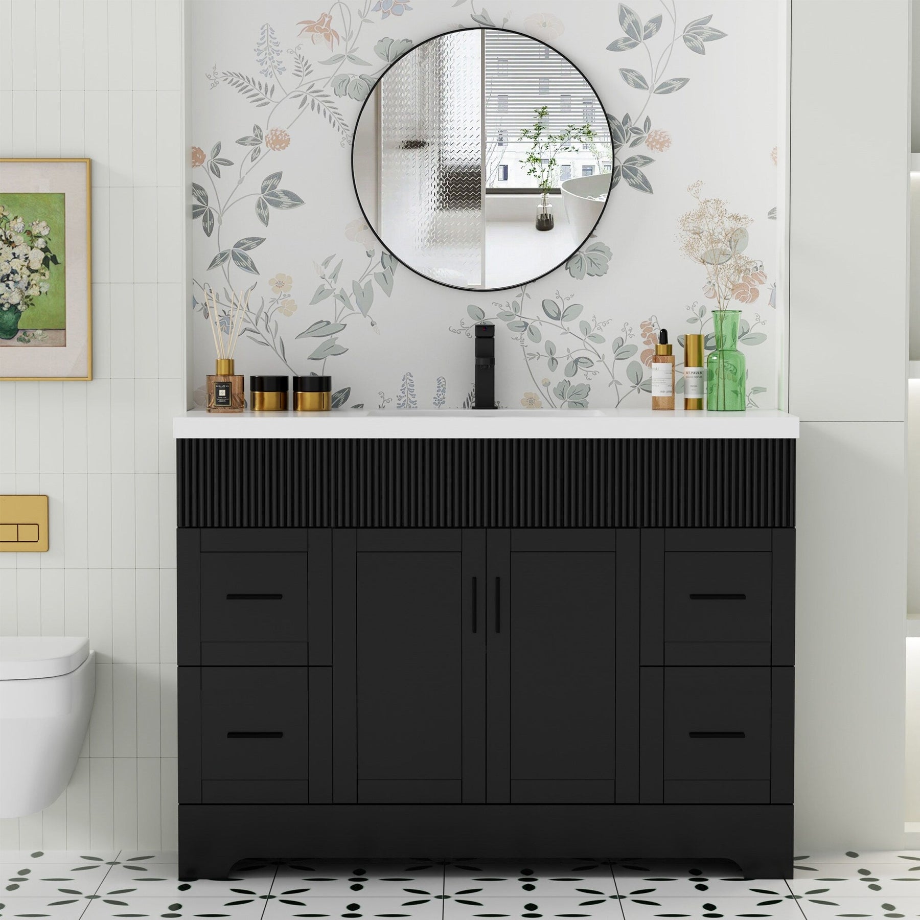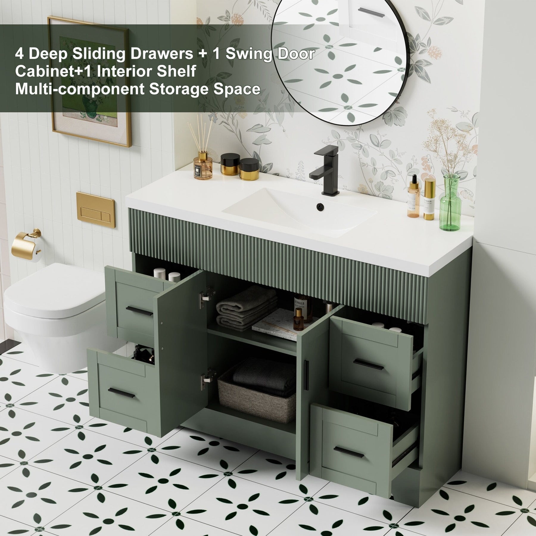 Upgrade your bathroom with this complete vanity set featuring eye-catching wavy line detailing. Available in 3 versatile sizes (30', 36', 48') and 3 on-trend colors (White, Green, Black), this freestanding vanity delivers contemporary style with exceptional storage. Premium wood construction ensures durability, while the included ceramic sink (30'/36') and lightweight SMC resin sink (48') offers easy maintenance.