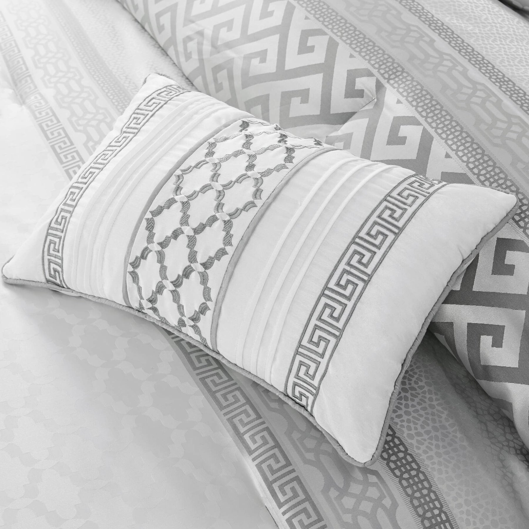 The Madison Park Christian 7 Piece Jacquard Comforter Set provides an elegant and luxurious update for your bedroom. This jacquard comforter features a striped design with geometric woven motifs to create an updated traditional look. The 2 matching shams repeat a similar striped pattern that pairs perfectly with the comforter. A solid bed skirt made from faux silk and 3 decorative pillows are also included, providing elegant finishing touches. Machine washable for easy care, this jacquard comforter set brings a refined traditional allure to your bedroom decor. Items in the set may come in a rolled or compressed packaging, which will need to be fluffed up or steam ironed before use to remove wrinkles.