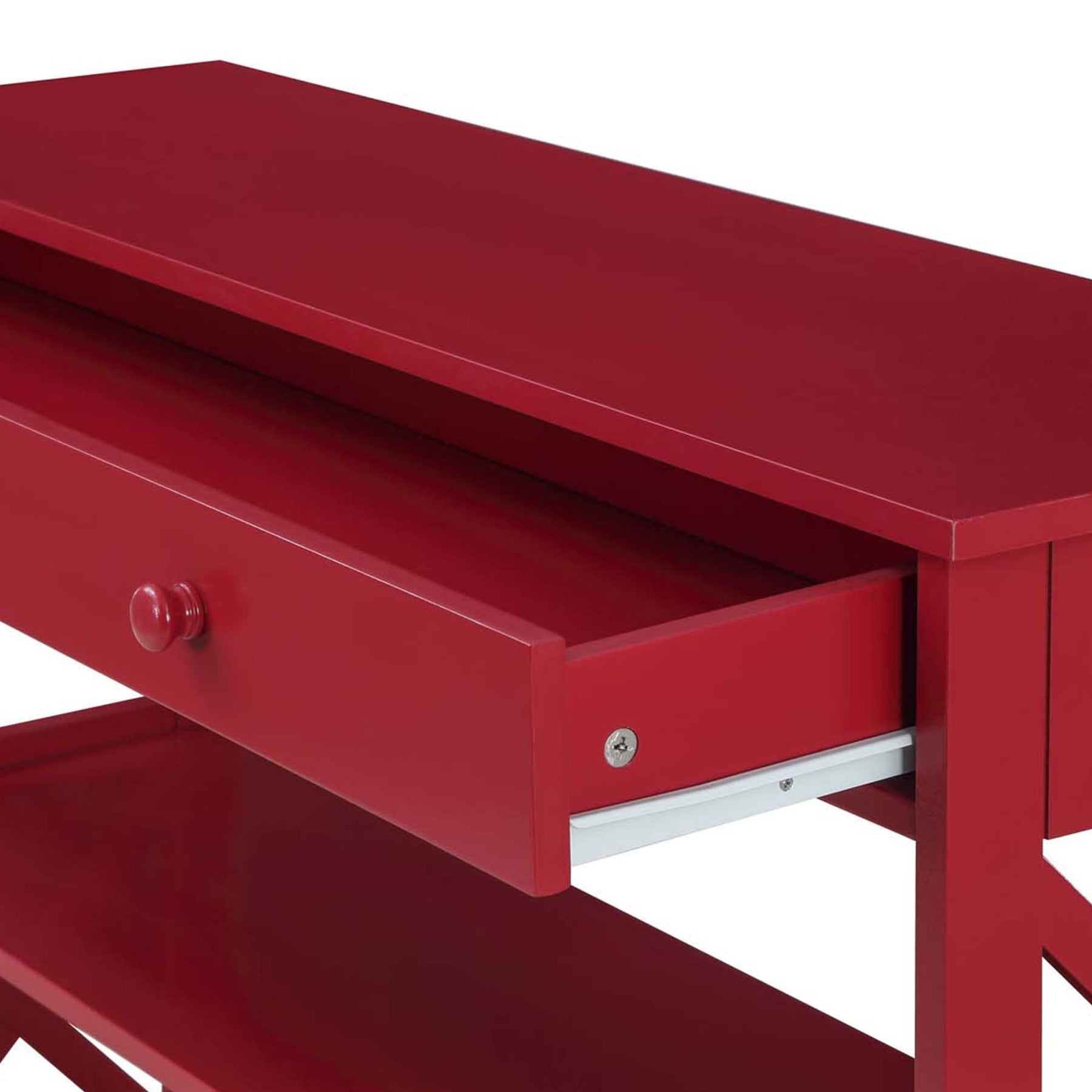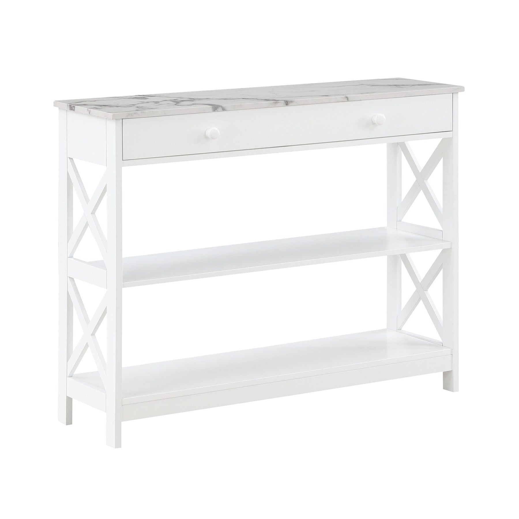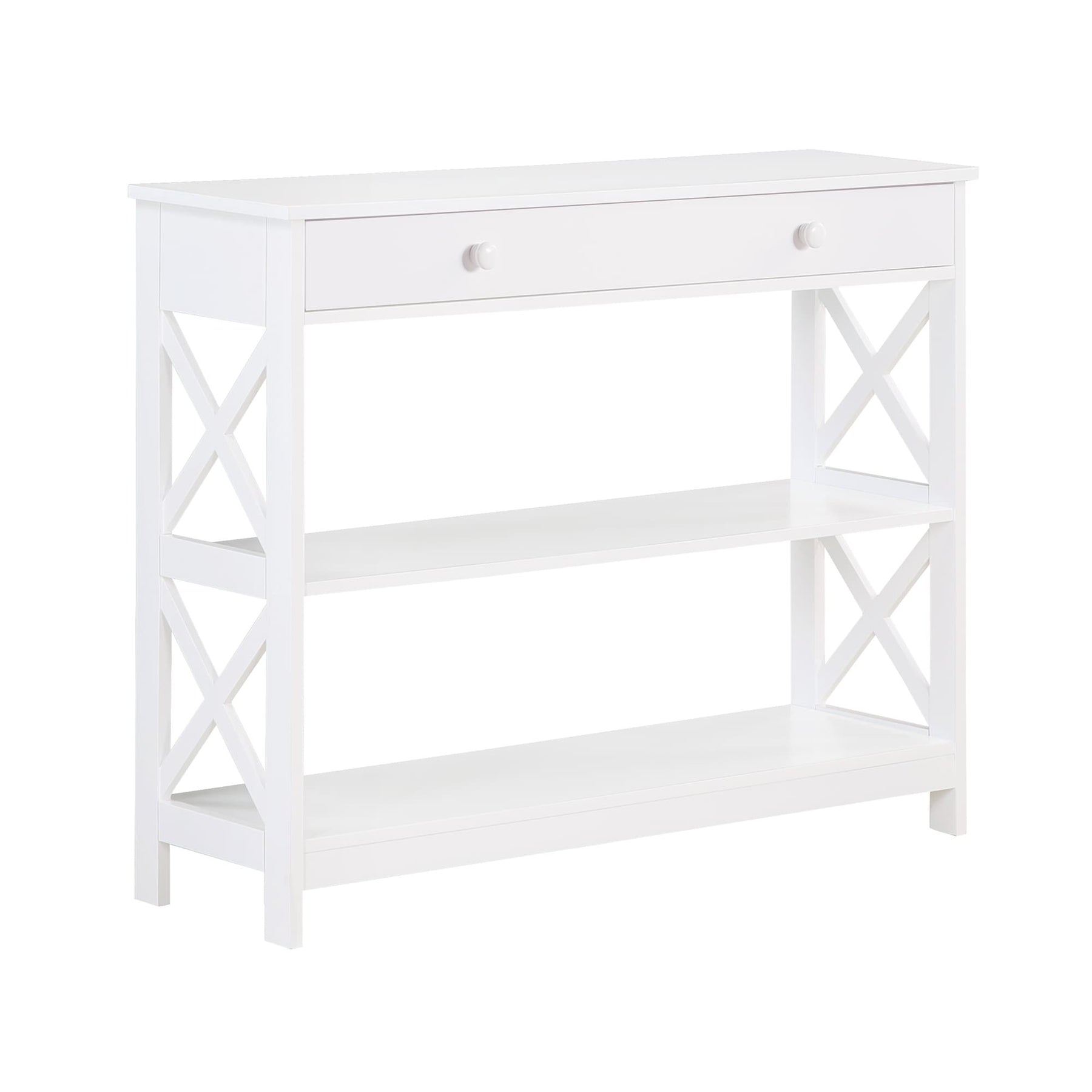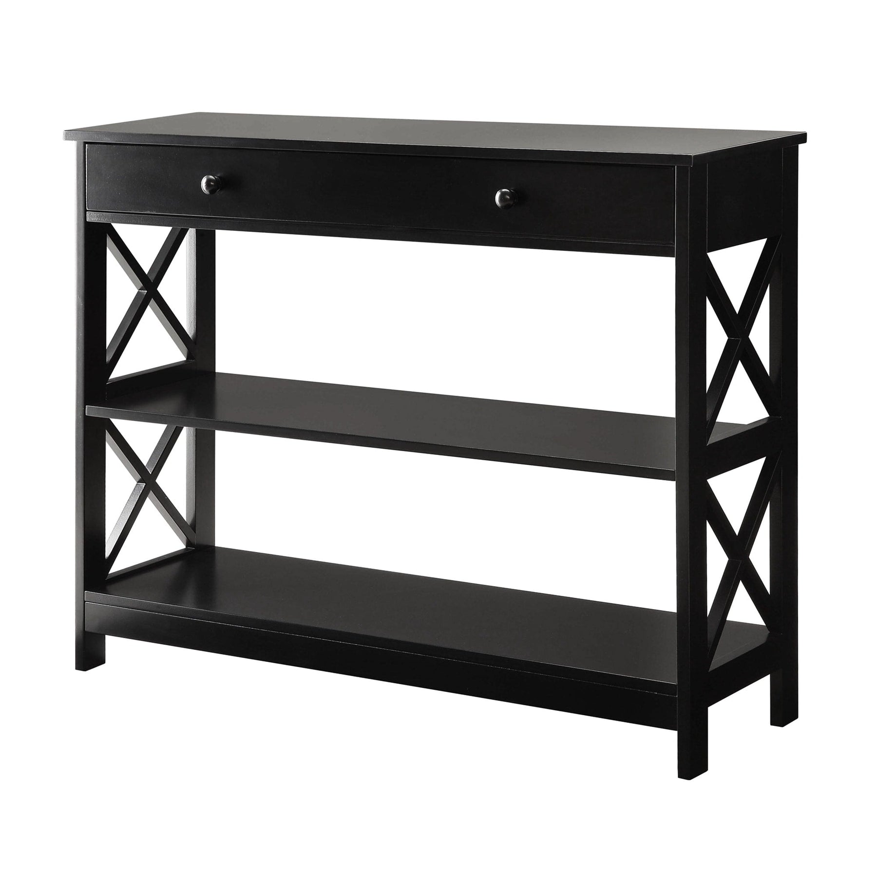 Make your home truly timeless with the Oxford 1 Drawer Console Table with Shelves by Convenience Concepts. This transitional piece features a pull-out drawer on smooth roller slides with two stylish drawer knobs for easy accessibility. The spacious drawer offers plenty of room to stow away entryway essentials and everyday necessities. The X-frame side panels and the three tiers of shelving make this console the perfect decorative piece to display in any room of your home. Beautifully crafted from MDF, non-lead-based paint, and particleboard, this unit is sure to last. Add coordinating pieces to your home from the Oxford Collection by Convenience Concepts, each sold separately.