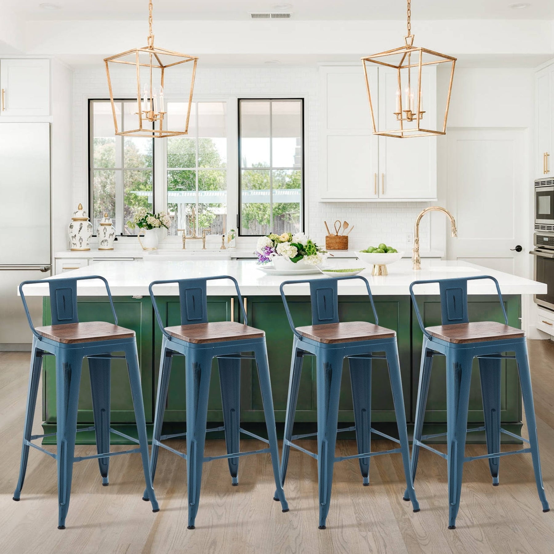 Upgrade your home or restaurant with the industrial style of these Bar Stools With Back. Each set includes four sturdy metal barstools with detachable backrests, making them easy to stack and store. Available in short, counter, and bar heights, these chairs are perfect for any dining or bar area. The wooden seats and durable electronic-sprayed finish make them both stylish and long-lasting, while the cross-bracing support and no-mar rubber feet ensure stability and floor protection.