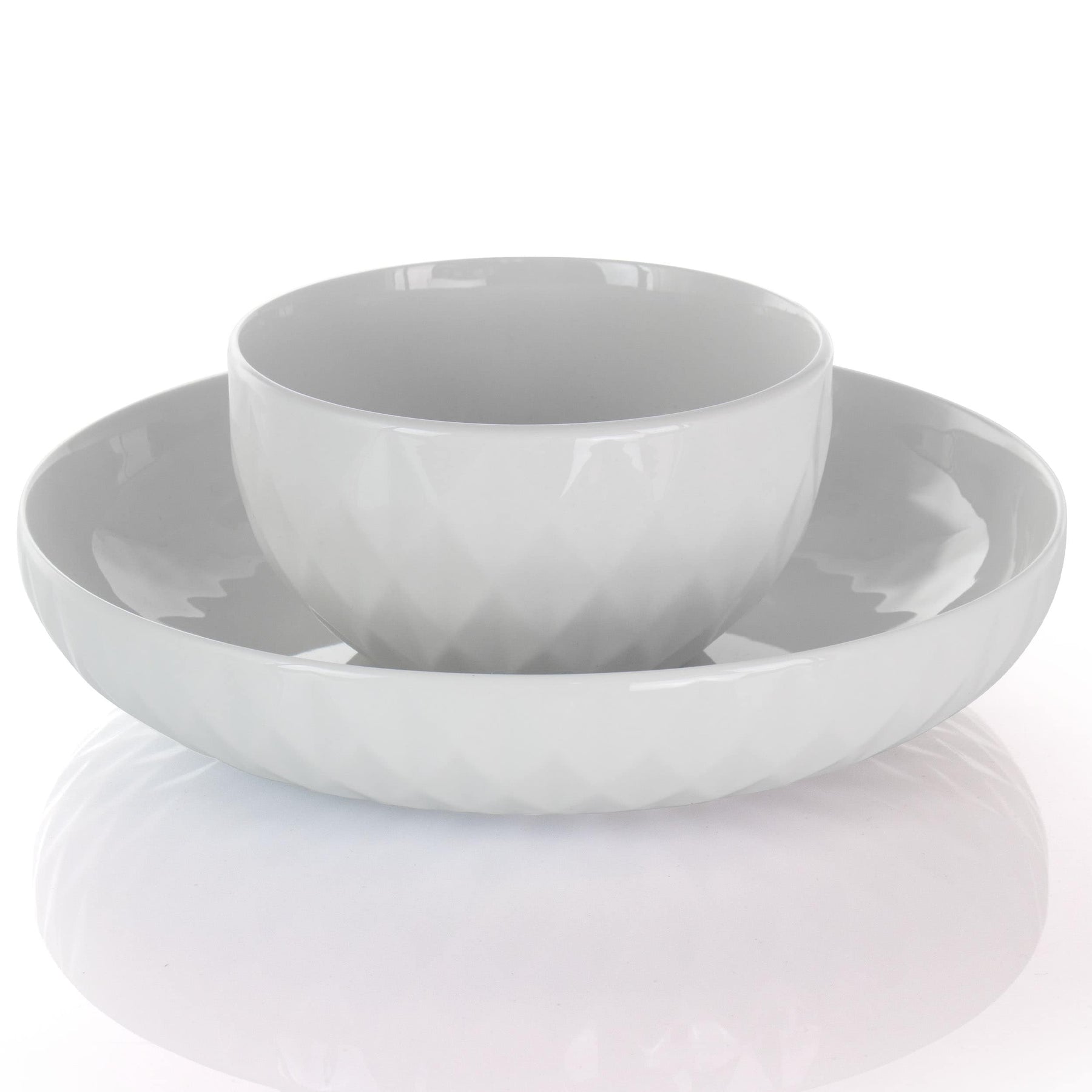 Elevate your dining experience with the Elama Sienna 18 Piece Stoneware Dinnerware Set in White. The minimalist design of the plates draws focus to your delicious entrees while the indented diamond patterns on the stoneware body add a touch of style. This set is dishwasher safe for easy cleaning and microwave safe for quick reheating. Serve your favorite dishes and impress your guests with this beautiful dinnerware set.