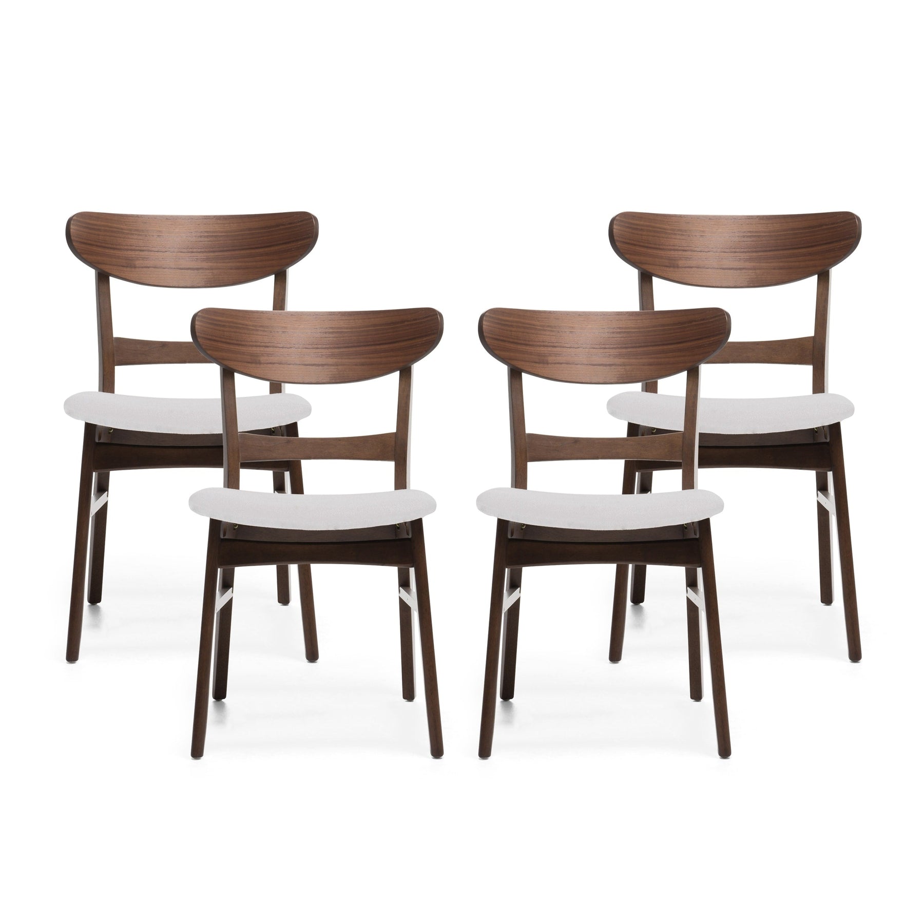 Introduce an elegant touch of mid-century modern style to your dining area with the Idalia Dining Chairs by Christopher Knight Home. Featuring iconic splayed legs and clean lines, this set of four armless chairs is perfect for adding sophistication to any space. The chairs are constructed with a robust rubberwood frame and foam-cushioned seating for firm support. The gently curved backs and beautifully finished wood frames add a refined appearance to these chairs. Choose from six different options, each featuring a gorgeous natural-grain look, combined with a stunning finish and beautifully upholstered seats. Assembly is required, and all the instructions and tools needed for assembly are included.