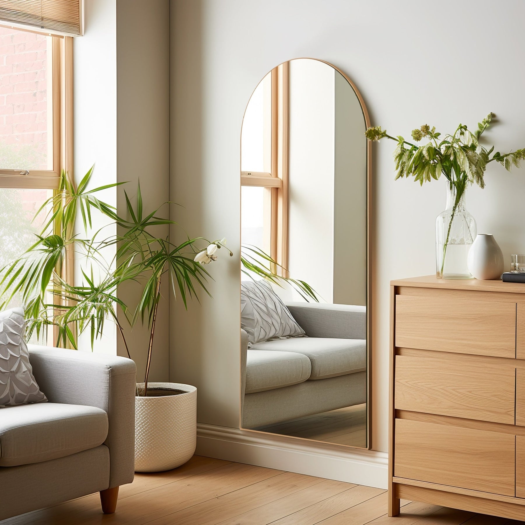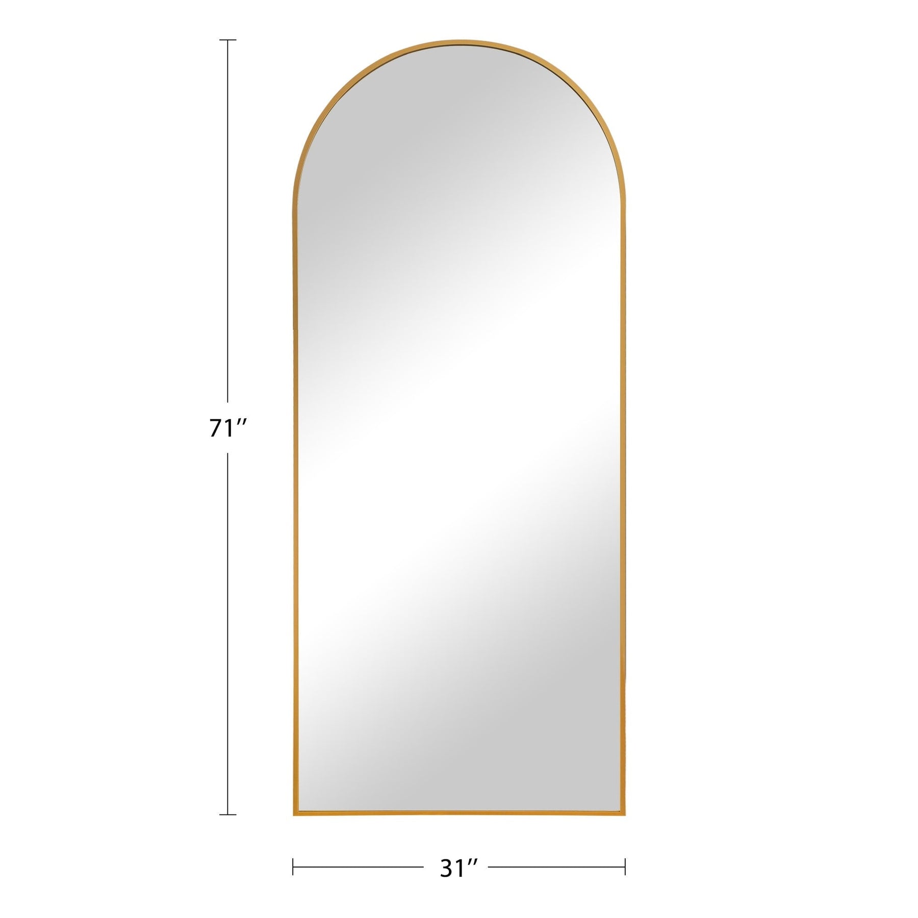 Elevate your space with the Arched Full Length Floor Wall Mirror, a standing mirror that brings a touch of sophistication to any room. This arch mirror's slim, ultra-thin frame and distinctive arch-crowned silhouette add a modern yet timeless appeal to your home decor. Crafted with shatter-proof glass, it offers exceptional reflective clarity and safety, making it a reliable choice for a full length mirror or floor mirror. Versatile in its installation, this standing mirror can be easily mounted on your wall or placed on the floor, available in multiple sizes to suit your space perfectly.