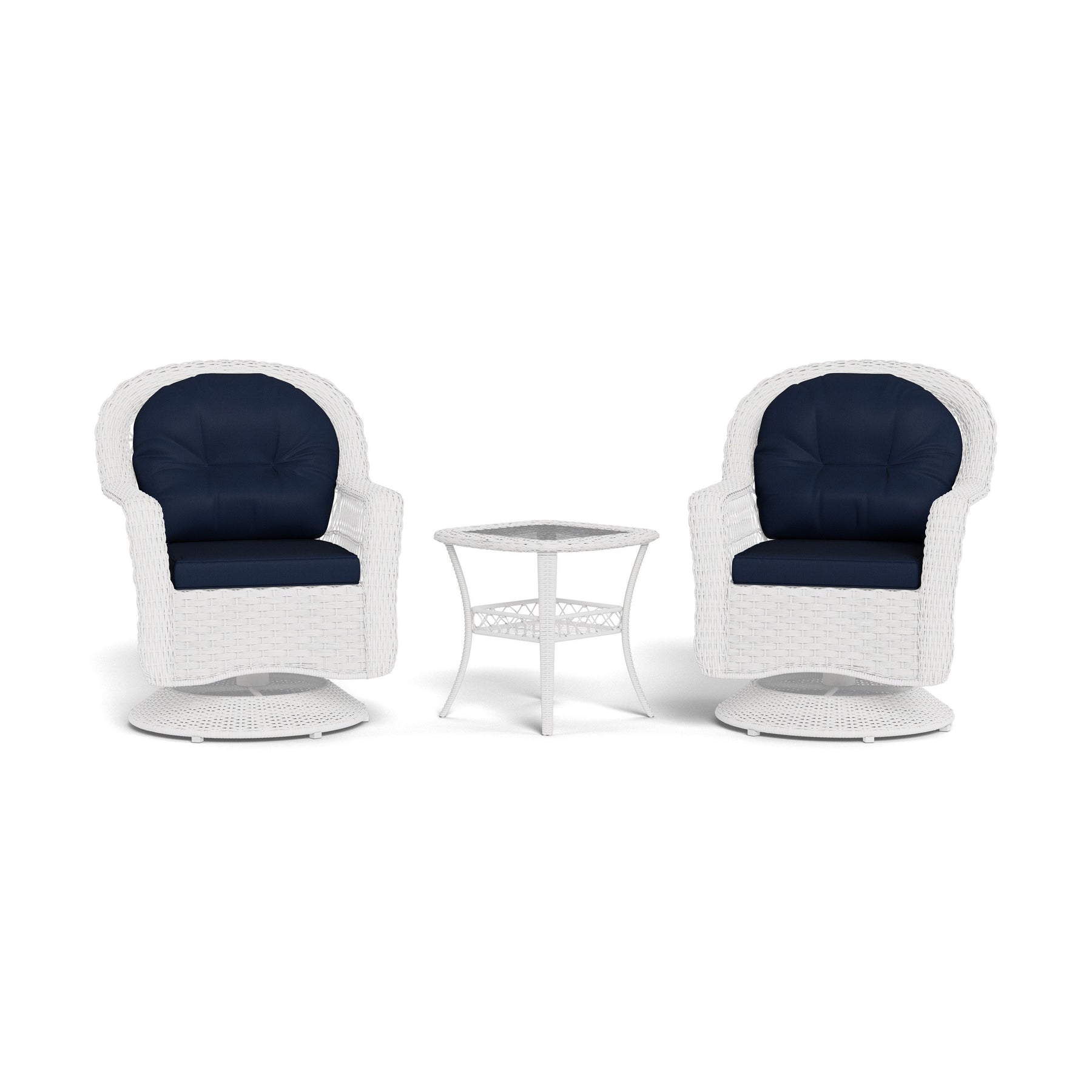 Relax in style with the Biloxi Outdoor White Wicker Swivel Glider Patio Set. Crafted by Tortuga Outdoor, this set includes two swivel glider chairs and a matching side table. The all-weather resin wicker construction withstands stains, cracks, and weather elements, while the powder-coated frames ensure durability for years. The set features blue cushions and a tempered glass top with a shelf. Create a cozy outdoor space with this charming Biloxi set.