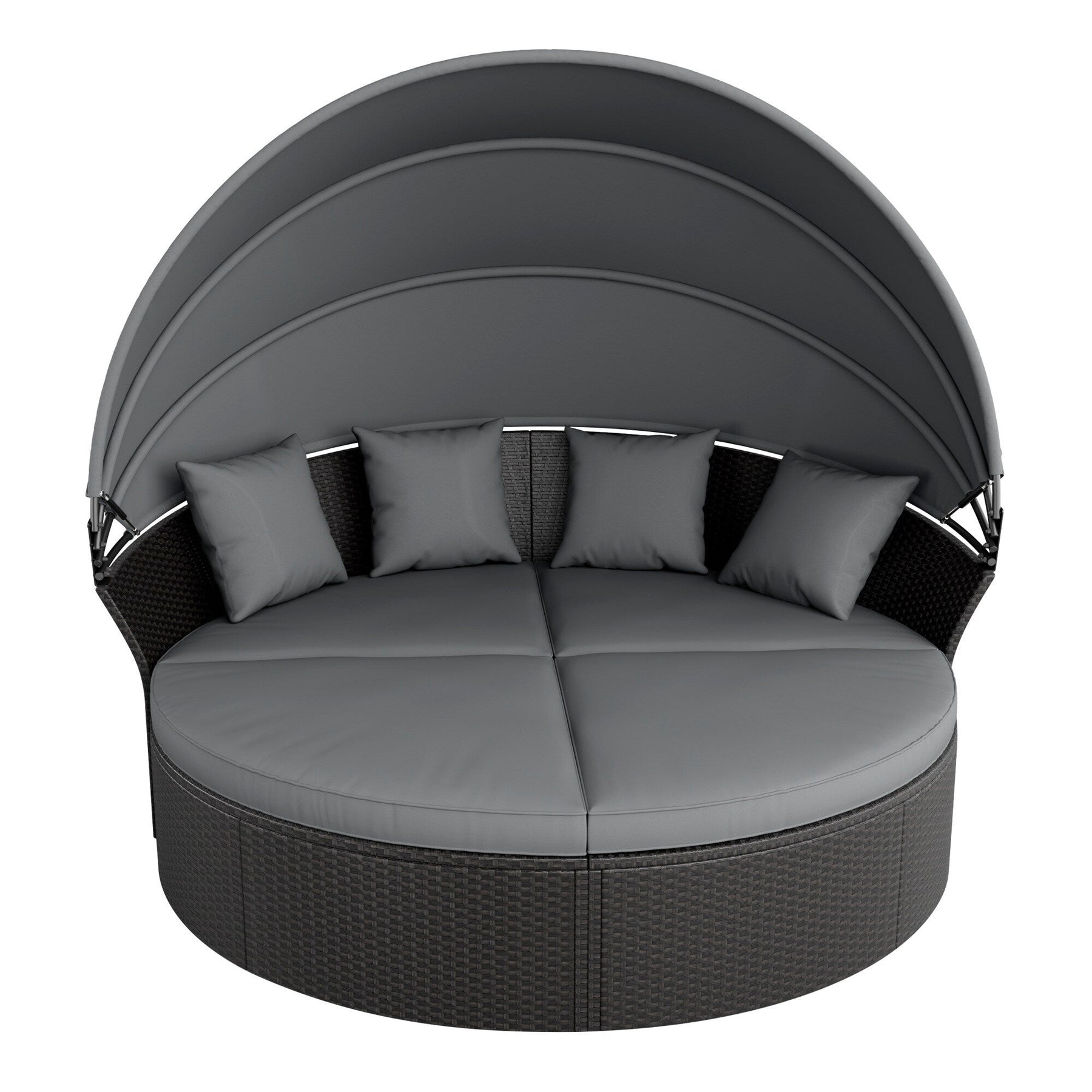 Unwind in style with the Nuon 4-piece Outdoor Wicker Patio Canopy Daybed Set by Havenside Home. This luxurious daybed set is perfect for relaxing while reading a book, sipping cocktails or catching a quick nap. Crafted with high-quality wicker and iron, this patio set features a sleek black finish that complements any outdoor decor. The set includes four comfortable wedge sofas, three cozy pillows, and a canopy to provide shade during those hot summer days.