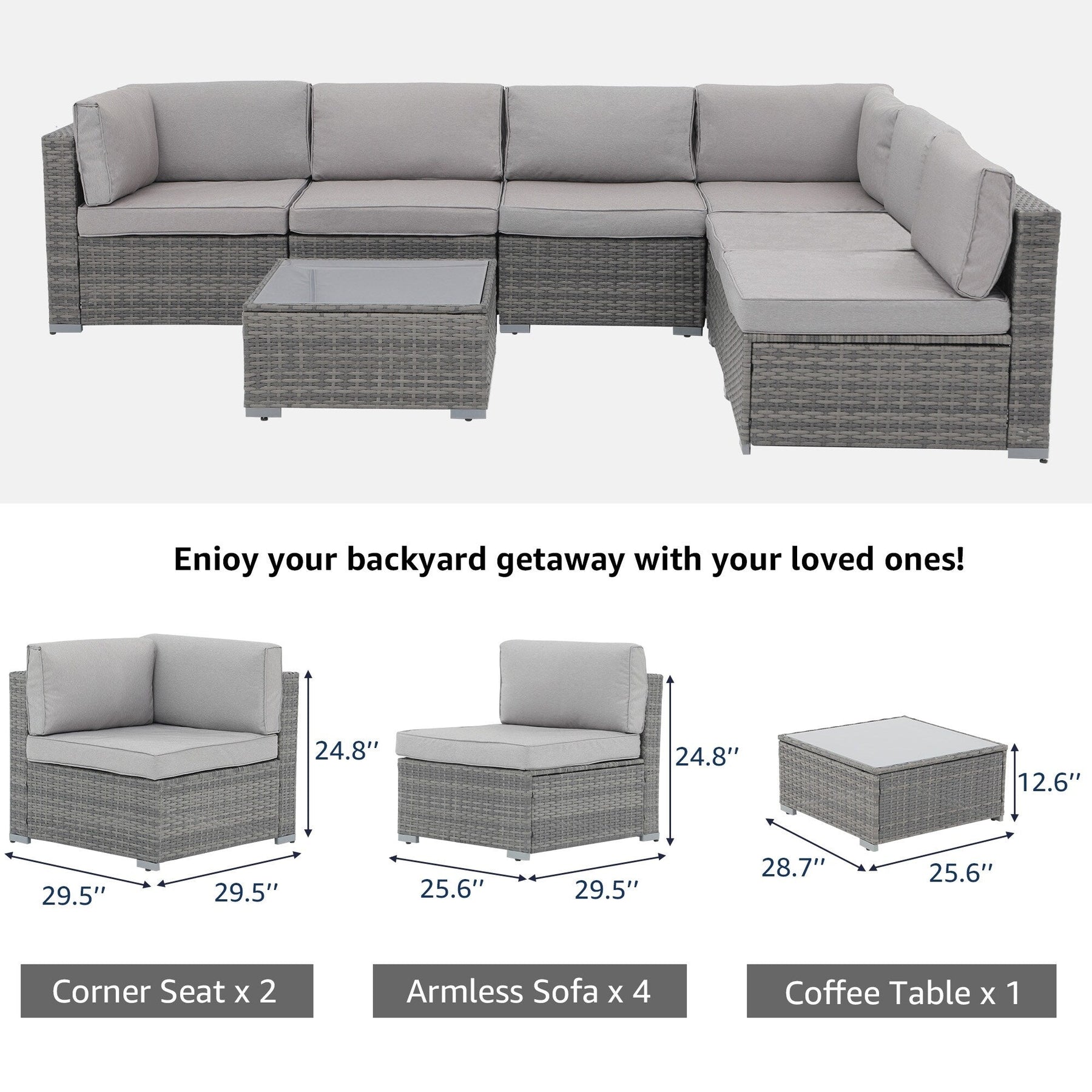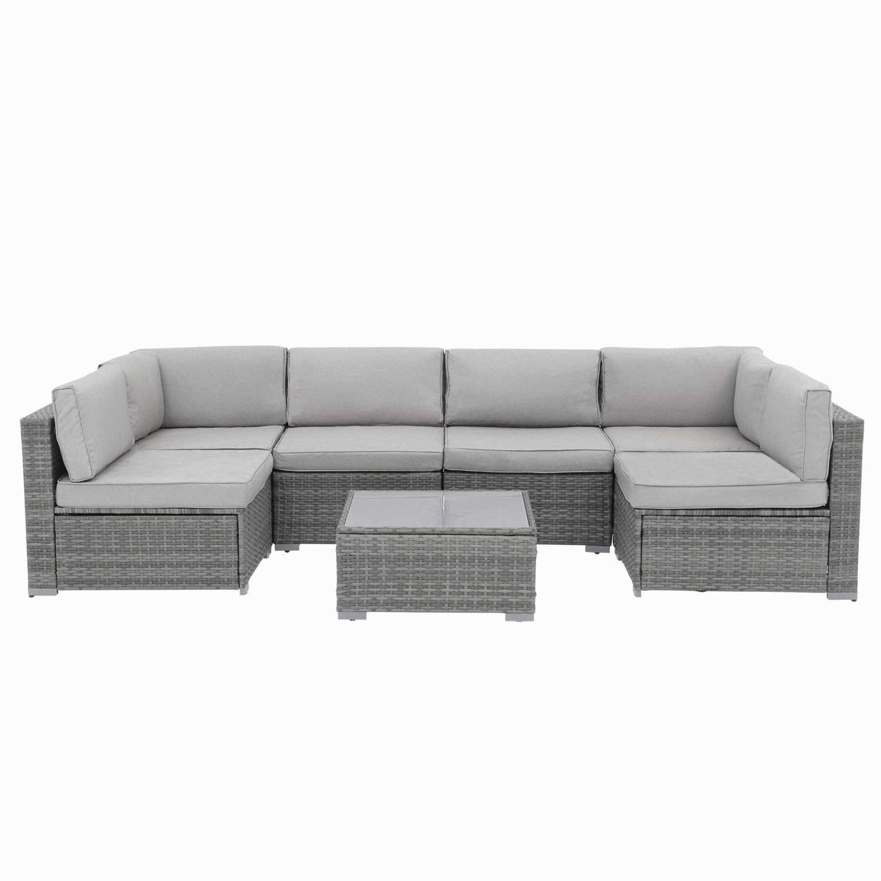 Add elegance and comfort to your outdoor space with the Wicker/ Steel 7-piece Outdoor Cushioned Sectional Sofa Set. The set features a sturdy steel frame wrapped in durable wicker that resists rust and outdoor elements. Cushions on each seat provide maximum comfort. With easy assembly and multiple configurations available, you can customize the set according to your needs.  In addition, a side table is included for added functionality and decoration.