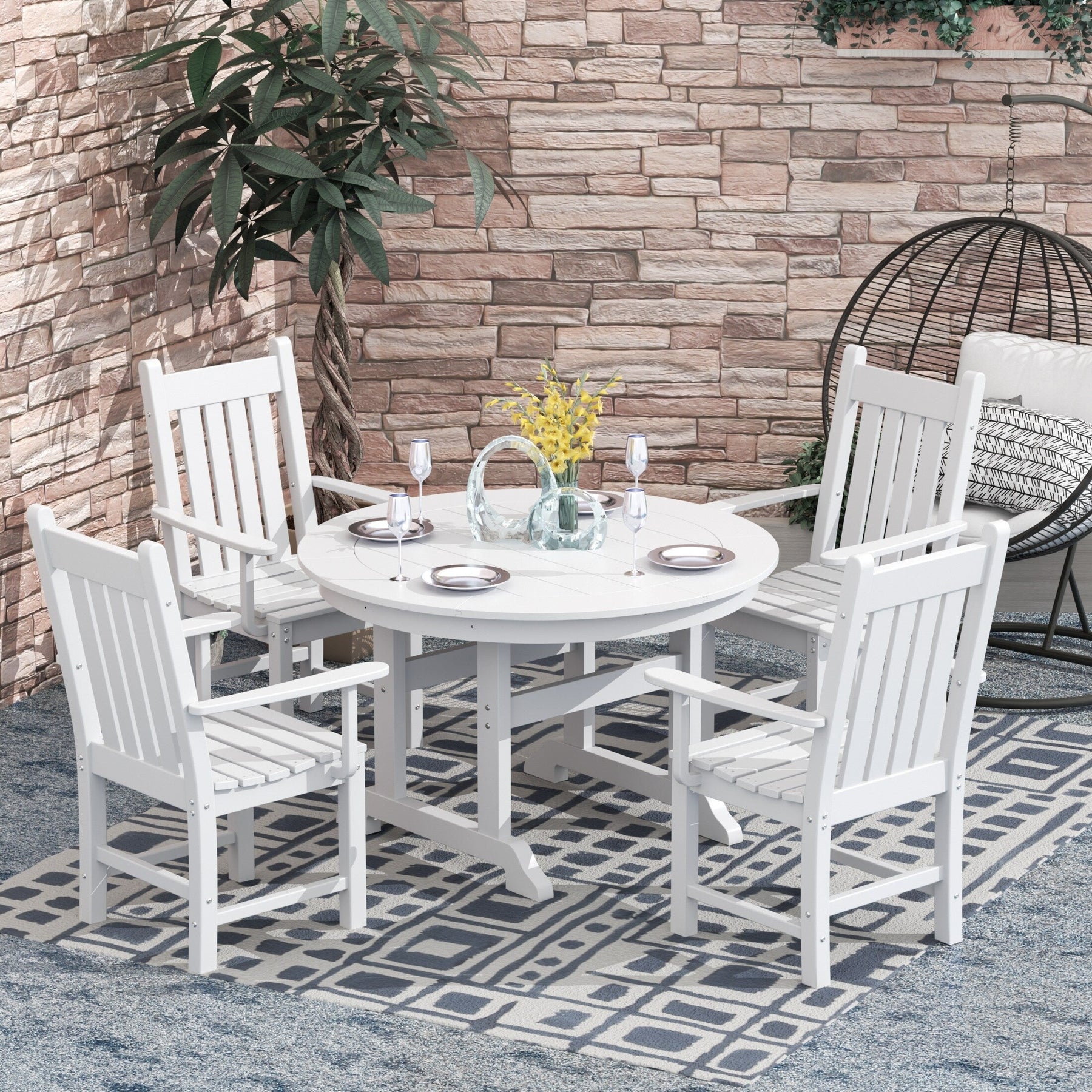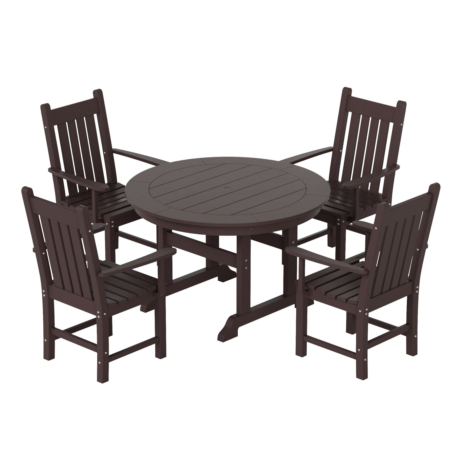 This traditional dining set brings friends and family together with its ample tabletop space, a durable frame, and attractive looks this set includes ?(1) Laguna Traditional Round Dining Table and (4) Armchairs. Our Laguna Round Dining Set with a heavy-duty construction made with our specially formulated HDPE and eco-friendly materials. Our HDPE is weather-resistant made to resist splits, cracks, rot, and peeling, for a lasting and attractive element you can enjoy for years to come. The sturdy frame features a slat-style tabletop for airflow not only trendy but functional. ?For added convenience, this table was made with a built-in umbrella hole (umbrella not included) to give you the option of shade cover from the blistering sun on a hot day. ?Whether you are entertaining guests or simply enjoying the outdoors this table will satisfy you for years to come.?