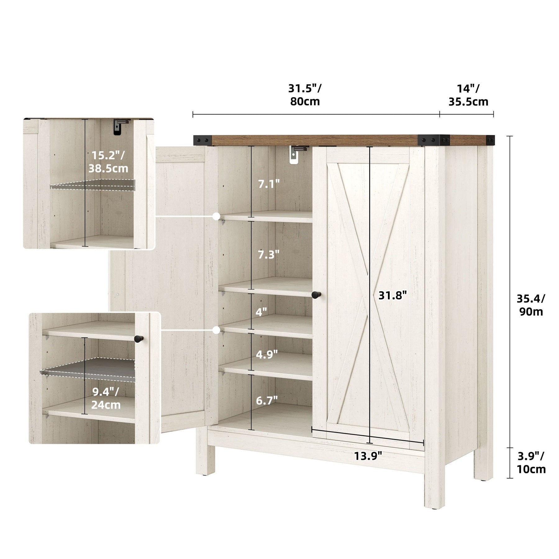 Step into organization with our spacious Shoe Cabinet. With 5 shelves that can accommodate 15-20 pairs of shoes, and a handy top for small items, it's a must-have for any home. The cabinet's exquisite X pattern adds a touch of farmhouse charm, while the adjustable 1st and 3rd shelves accommodate all types of footwear. Crafted from durable MDF with sturdy wooden legs, it's designed for stability and longevity. Remember to install the included anti-tip kit for safety.