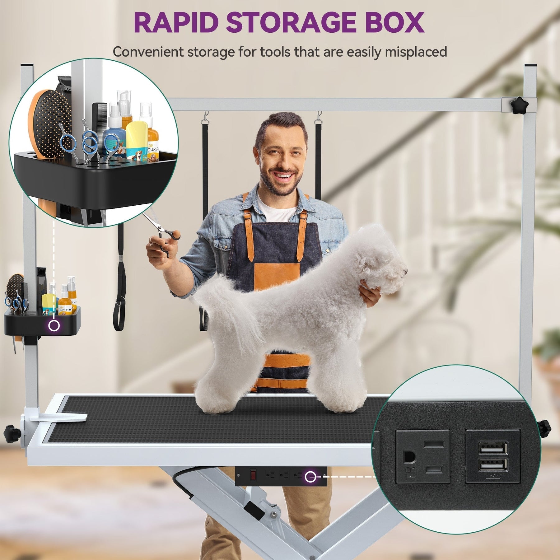 A professional pet grooming table that befits pet grooming;    Sturdy and durable steel frame base with X-shaped design to achieve immense 220lbs load capacity;    Comes with leg levels for uneven floors and elevated arms that grant hefty stability to prevent accidental damage or injury.   This electric lifting grooming table features a powerful motor system and foot pedals for smooth and quiet 11.8'-39.4' height adjustment;    Groom your pets with ease without having to bend down;    Large dogs can conveniently get on & off the table.   As the ultimate grooming solution, this grooming table for dogs offer a portable storage box to keep beauty tools at hand and tidies up the beauty area so beauticians can focus on their craft;     AC outlet and USB port add-ons offer easy access to grooming equipment.